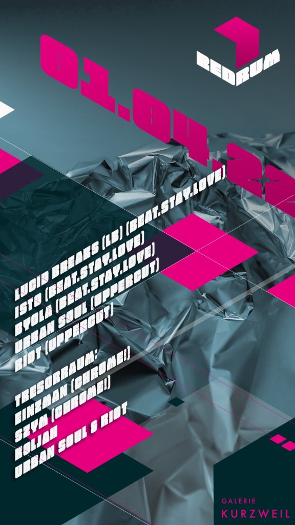 uppercut & Beat.Stay.Love pres. Redrum IV: Nach der unglaublichen dritten Redrum-Party vergangenen Dezember steht die Galerie Kurzweil am 1. April 2022 wieder ganz im Zeichen bester basslastiger Musik.