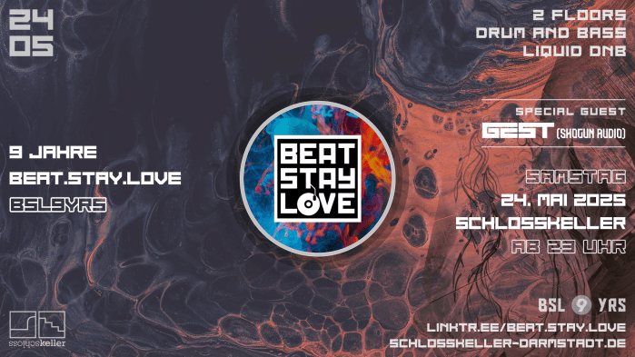 9 YEARS OF DRUM&BASS // ANNIVERSARY EVENT // GEST (Shogun Audio) + BSL CREW & FRIENDS BEAT.STAY.LOVE9 YEAR ANNIVERSARYIM SCHLOSSKELLER 2 FLOORS: DRUM & BASS + LIQUID DNB Wir feiern 9 Jahre Drum & Bass in Darmstadt – und laden zum großen Birthday Bash ein! Am 24. Mai wird das neunjährige Bestehen von Beat.Stay.Love im … Weiterlesen SOON: 9 Jahre BSL feat. GEST (Shogun Audio) @ Schlosskeller (24.05.2025)