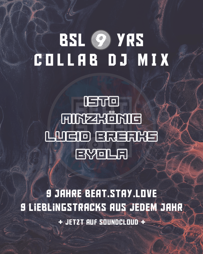 9 YEARS OF BEAT.STAY.LOVE9 TRACK FAVOURITES OF EVERY YEARSELECTED & MIXED BY ISTO, MINZKÖNIG, LUCID BREAKS & BYOLA Für unser 9-jähriges Jubiläum haben wir uns etwas besonderes überlegt: Für jedes Jahr ein persönlicher Lieblingstrack, ausgewählt und abgemischt von den BSL Residents: Isto, Minzkönig, Lucid Breaks & Byola 9 persönliche Picks, 9 mal Drum & Bass – … Weiterlesen Neuer Mix: BSL9YRS Anniversary Collab Mix by Isto, Minzkönig, Lucid Breaks & Byola