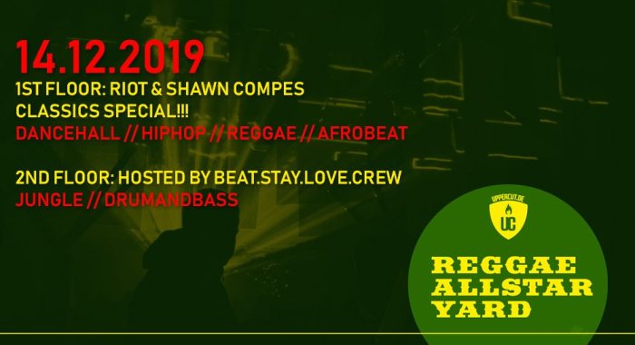 TIME FOR BEATS THEY LOVE AGAIN!!! Heute Abend übernimmt Beat.Stay.Love wieder den zweiten Floor beim Reggae Allstar Yard im Schlosskeller Darmstadt! 100% drum and bass | 100% beats they loveFacebook-Event: Reggae Allstar Yard | 14.12.2019 Schlosskeller Darmstadt1st FLOOR: RIOT & SHAWN COMPESRETURN OF FATHER & SONCLASSICS SPECIAL!!! DANCEHALL // HIPHOP // REGGAE // AFROBEAT 2nd … Weiterlesen TONIGHT: BSL @ Allstar Yard im Schlosskeller Darmstadt