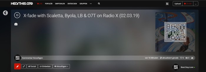 Die "X-Fade die DJ Nacht"-Aufnahme vom 3. März 2019 mit Scaletta, Byola, LB und O7T auf Radio X ist seit Kürze auf unseren Mixcloud und Heathis Profilen online. Enjoy! https://www.mixcloud.com/BeatStayLove/x-fade-with-scaletta-byola-lb-o7t-on-radio-x-020319/https://hearthis.at/beat.stay.love/x-fade-with-scaletta-byola-lb-o7t-on-radio-x-020319/ https://www.mixcloud.com/BeatStayLove/x-fade-with-scaletta-byola-lb-o7t-on-radio-x-020319/